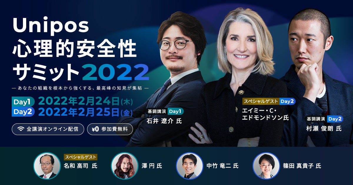 心理的安全性を高め、組織課題を解決するHRテック事業として「ピアボーナス®︎Unipos」(以下、Unipos)を提供するUnipos株式会社(本社:東京都港区、代表取締役社長CEO:田中弦)は、心理的安全性をテーマとしたカンファレンスとしては日本で最大規模となる「Unipos心理的安全性サミット2022」を2022年2月24日(木)、25日(金)の2日間にわたりオンラインで開催します。心理的安全性の世界的権威でありハーバード・ビジネススクール教授のエイミー・C・エドモンドソン氏や「心理的安全性のつくりかた」の著者 株式会社ZENTech 取締役 石井 遼介氏など心理的安全性の第一人者に加え、組織づくりの専門家と第一線で活躍されている実践者が総勢20名登壇します。