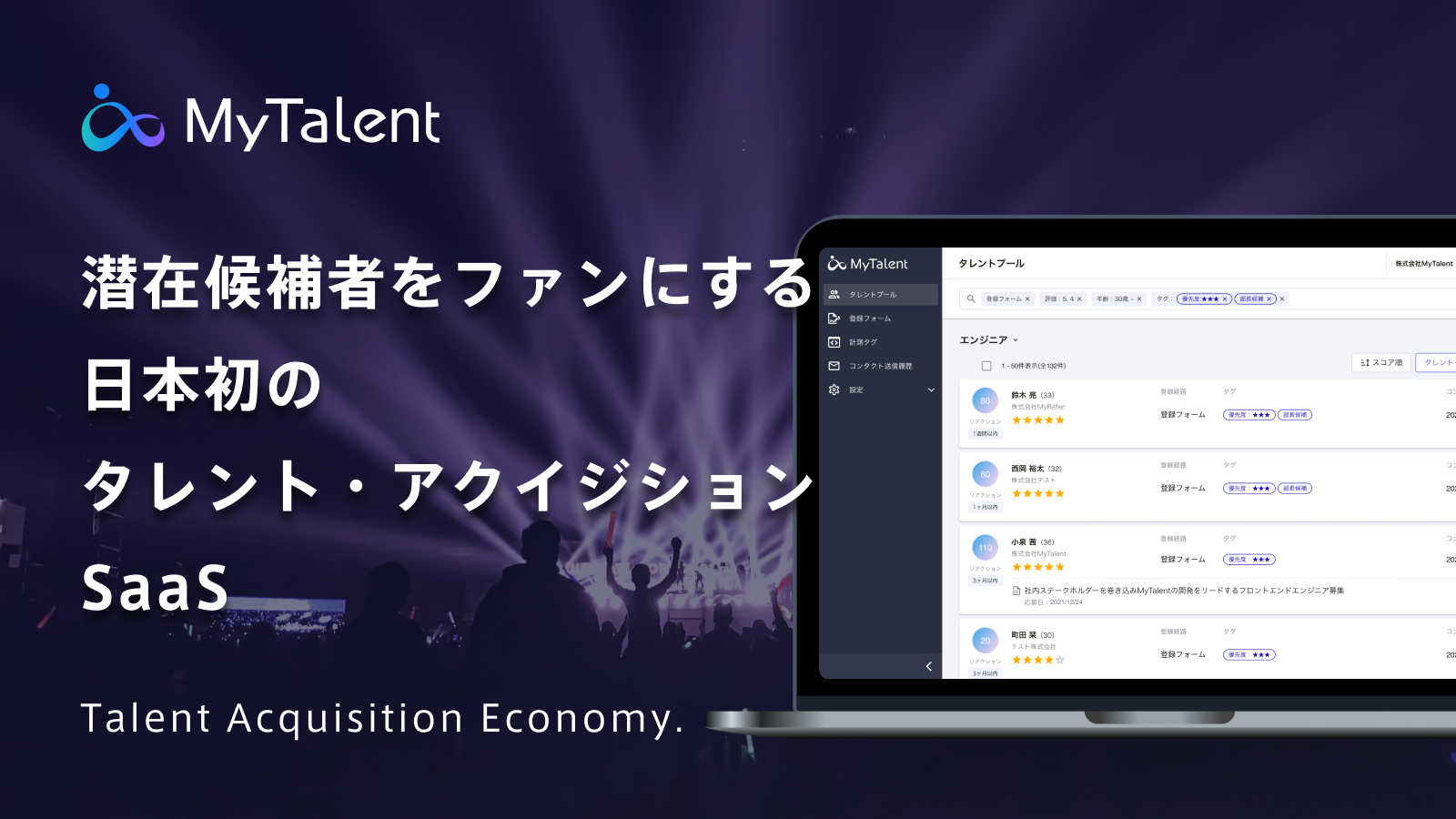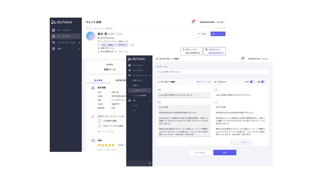 MyReferは、これまで人と人とのつながりから採用する「リファラル採用」という日本の採用市場にない概念を啓蒙し、800社、60万名の従業員に導入され、新たな採用の潮流を創ってきました。そんななか、日本の採用市場に次なる変革を起こすため、リファラル採用で培った転職潜在層への採用マーケティング機能を強みに、企業と採用候補者の“つながり”を資産に変える日本初のタレント・アクイジションSaaS「MyTalent」の開発に至りました。