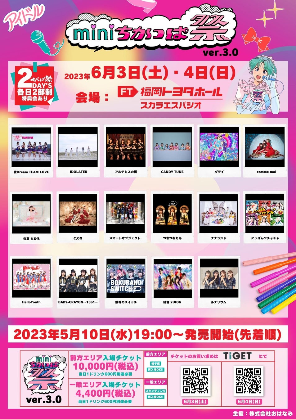 2023年6月3日(土)・4日(日)に福岡トヨタホールスカラエスパシオにて、全国のアイドルが福岡に集うライブイベント『miniちかっぱ祭ver.3.0』が開催されます。