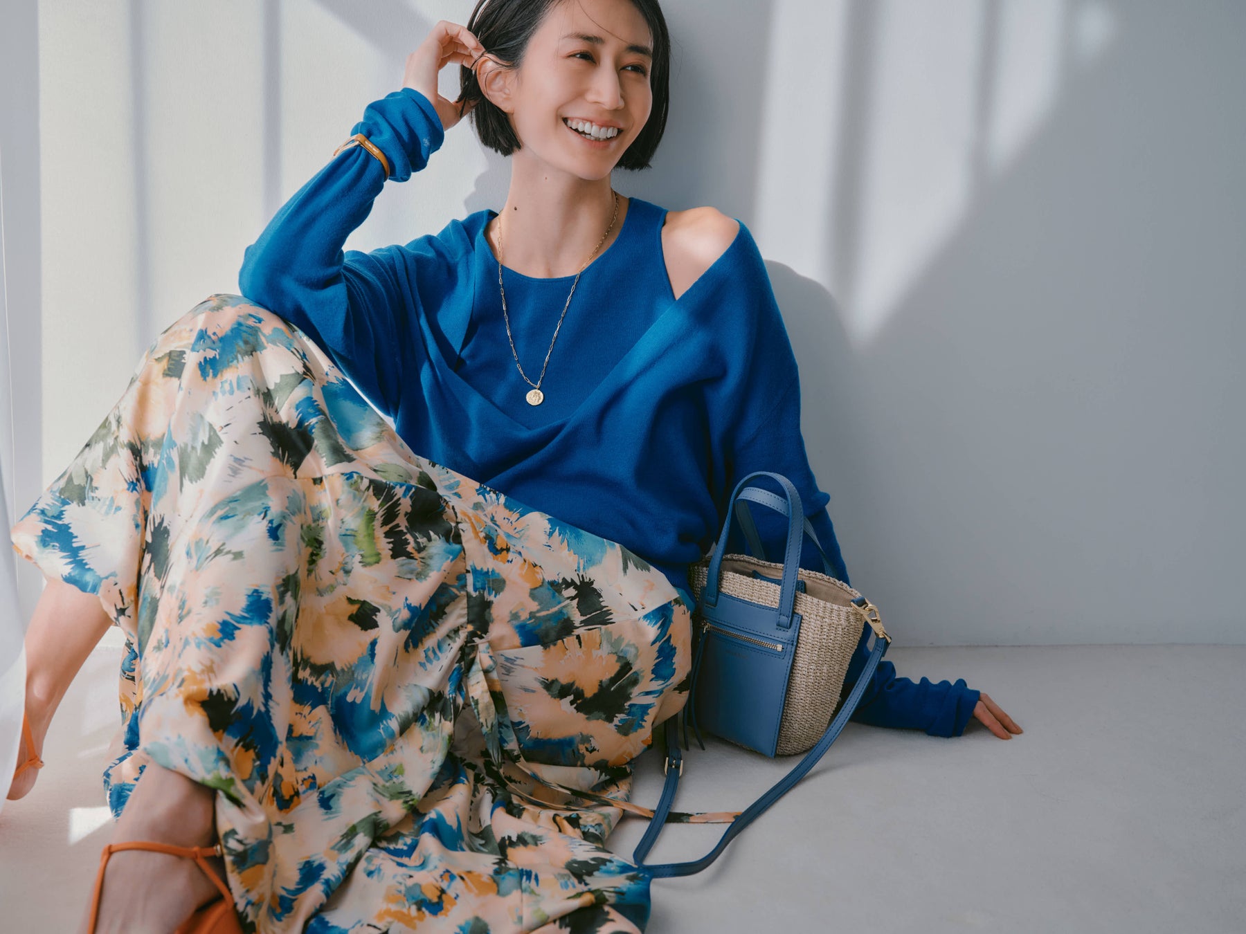 キレイ色ニットや柄スカートは、春にはつい手が伸びる定番アイテム。だからこそ、今っぽいディテールで更新したい! アメリカンスリーブのタンクトップとVネックニットのセットは、着るだけで健康的な肌見せが叶う便利アイテム。オリジナルフラワープリントのバルーンスカートは、膝上位置のドロストでマーメイド風ラインにもアレンジ可能。コーデに合わせてシルエットを変化できます。