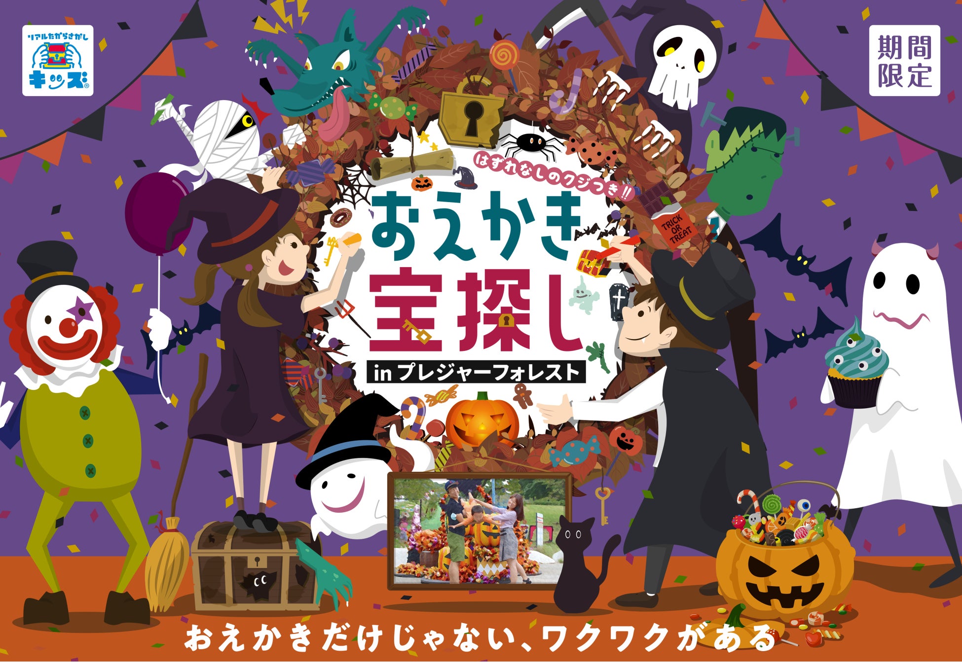 今回の「おえかき宝探し」はハロウィン特別版。プレジャーフォレストの広大な敷地に隠れた「おばけ」を手がかりを元に探し出してください。「おえかき」と「宝探し」の要素が一緒になっており、お子様はもちろん、大人でも楽しめるコンテンツとなっています。また、すべての「おばけ」を探し出すと、ハズレ無しのくじ引きに参加できます。