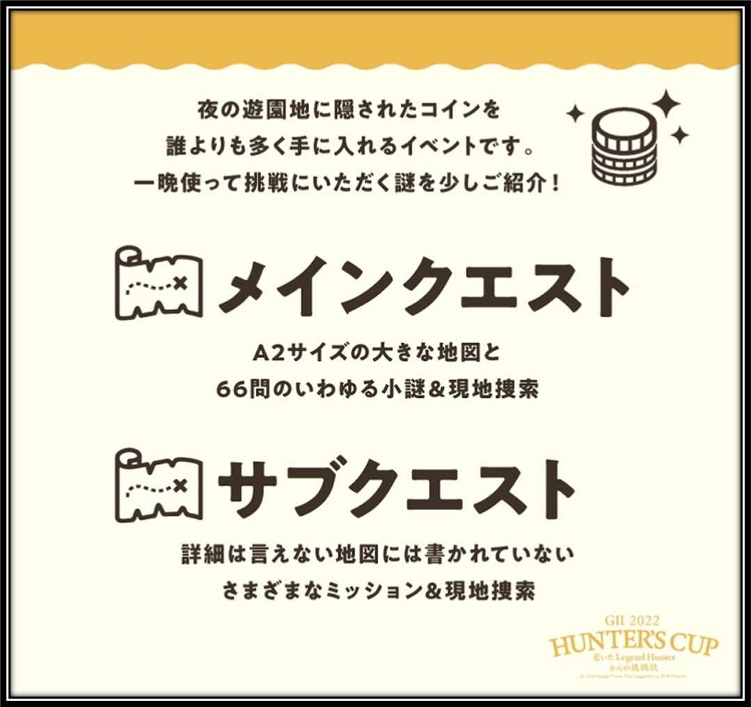 タカラッシュがお届けする史上初のオールナイト宝探し。300人限定で行われるイベントで、選ばれた者「プロハンター」のみが参加できる優勝賞金1,000万円のリアル宝探し「GⅠチャンピオンシップ大会」の前哨戦となる大会です。上位10位に入賞した参加者には豪華商品のほか、優勝賞金1,000万円の「リアル宝探し大会」へ参加できる「プロハンターゼロ」の資格を手に入れることができます。今回、挑戦できるクエストはメインクエストとサブクエストの2種類。誰よりも多くのコインを獲得して豪華賞品を手に入れるイベントとなります。