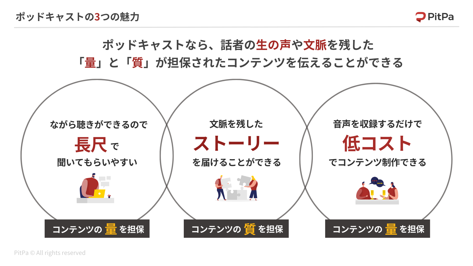 ポッドキャストとは、インターネットを通じて聴取することができる音声コンテンツです。ポッドキャストでの発信は、他のメディアにはない魅力が多数存在しています。音声だけで楽しめるからこそ「ながら聴き」ができ、それ故に長尺で聴取してもらえることから、聴き手のロイヤリティを形成しやすく、複雑な文脈の内容も正確に伝えることができます。また、動画やテキストメディアに比べて安価で制作できるのも音声メディアの魅力です。
