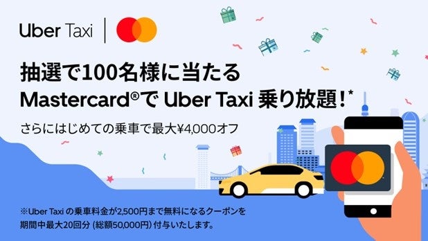 Mastercard ® 決済で使えるUber Taxi乗り放題*クーポンが抽選で100名様に当たる!さらに、初めての乗車で最大4,000円オフクーポンが当たるプレゼントキャンペーンを同時開催