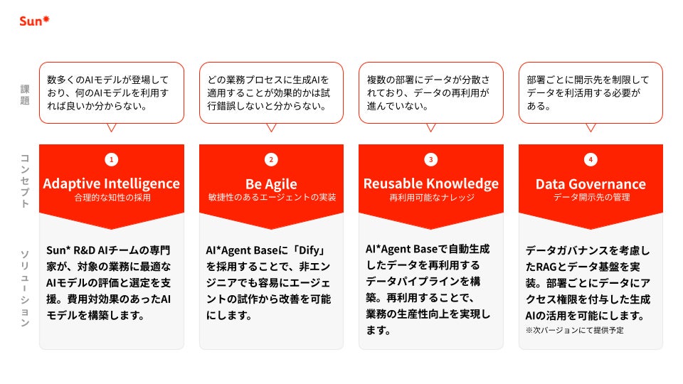 Sun*、企業向け生成AIエージェント統合プラットフォーム「AI*Agent Base」を提供開始