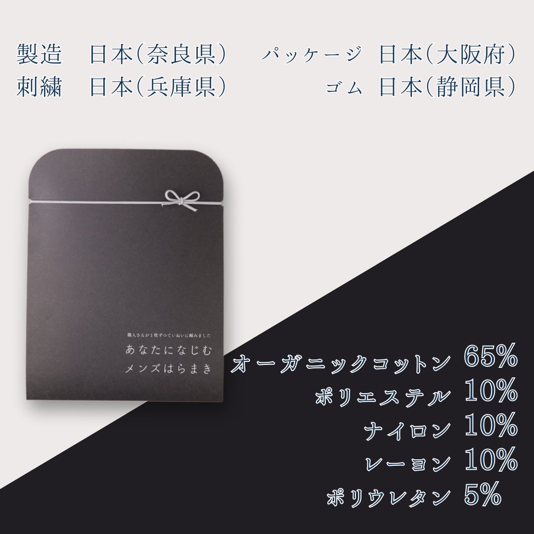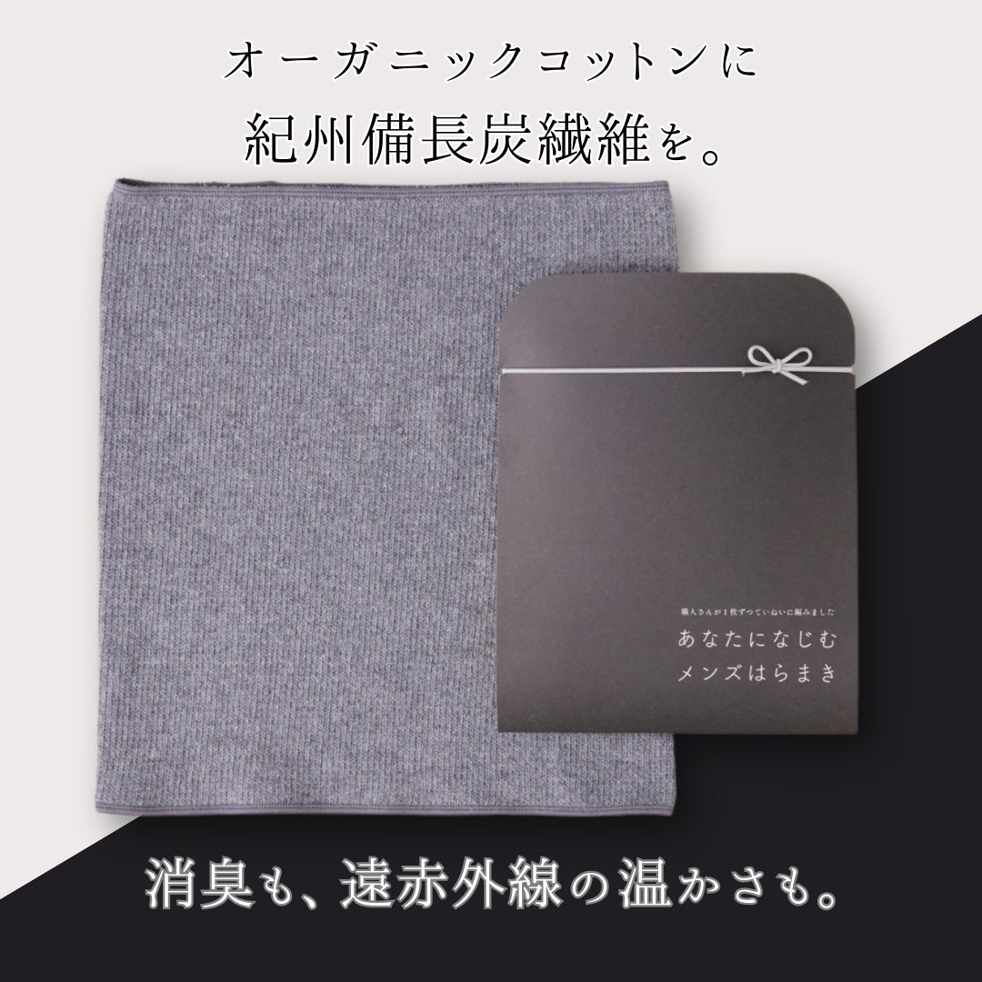 オーガニックコットンに紀州備長炭繊維を混ぜ込み、昔ながらのアナログ編み機にてていねいに仕上げた逸品。一般的な腹巻きと比較してかなりうすめのため、ごわつくことなくやさしく体を包み込みます。消臭、通気性など、男性用ならではの機能性も兼ね備えています。製造は全て国内で行い非常に質が高く、冷えやすいおなか周りをしっかりサポートいたします。