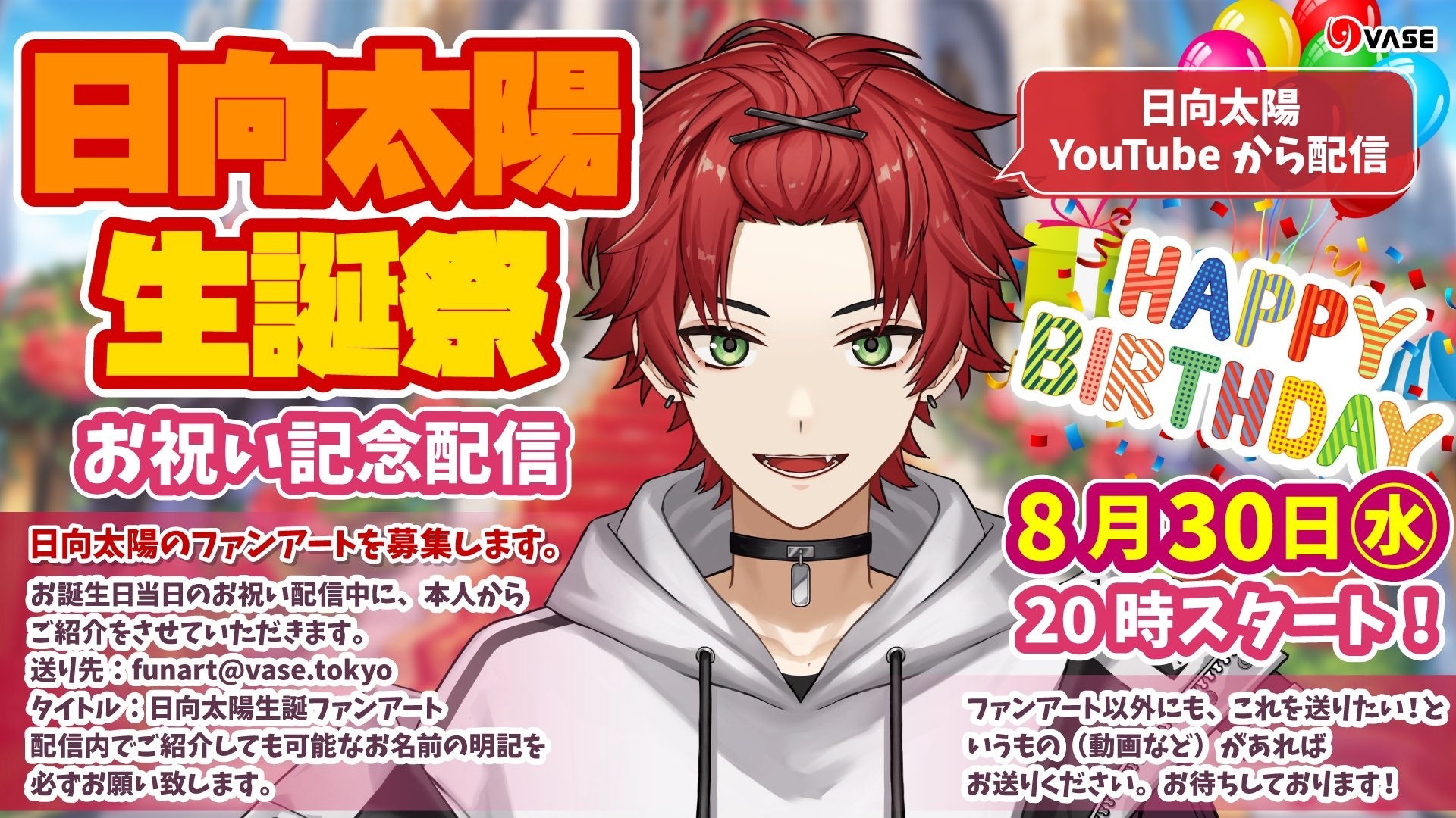 バーチャルライバーグループVASE(ヴェイス)に所属する日向太陽が、2023年8月30日(水)誕生日当日に「生誕祭配信」を開催。