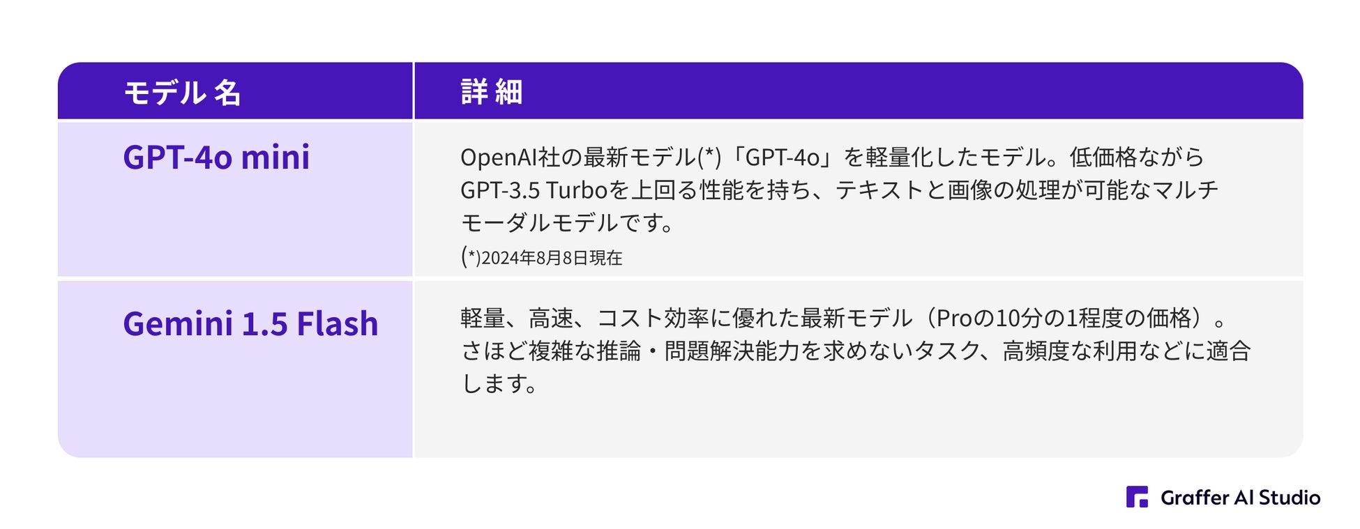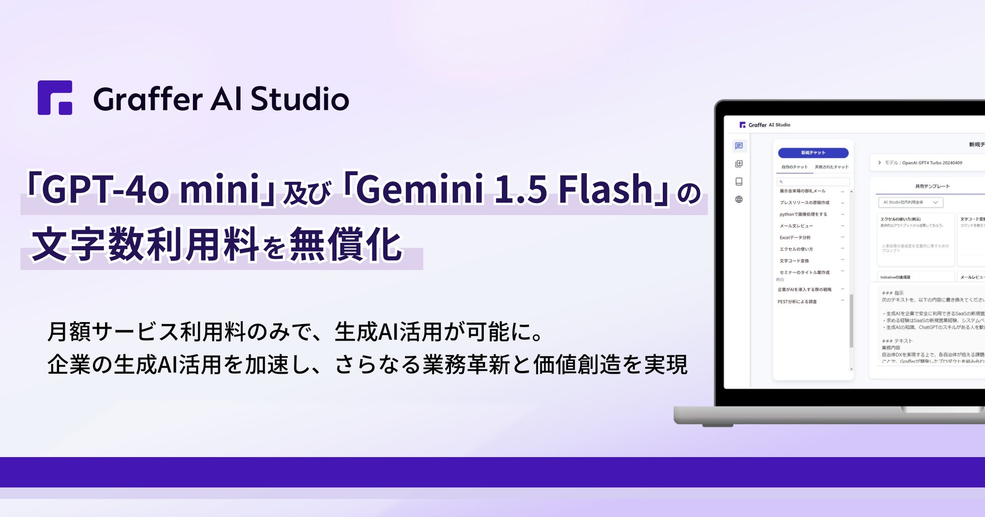 Graffer AI Studio、「GPT-4o mini」及び「Gemini 1.5 Flash」の文字数利用料を無償化