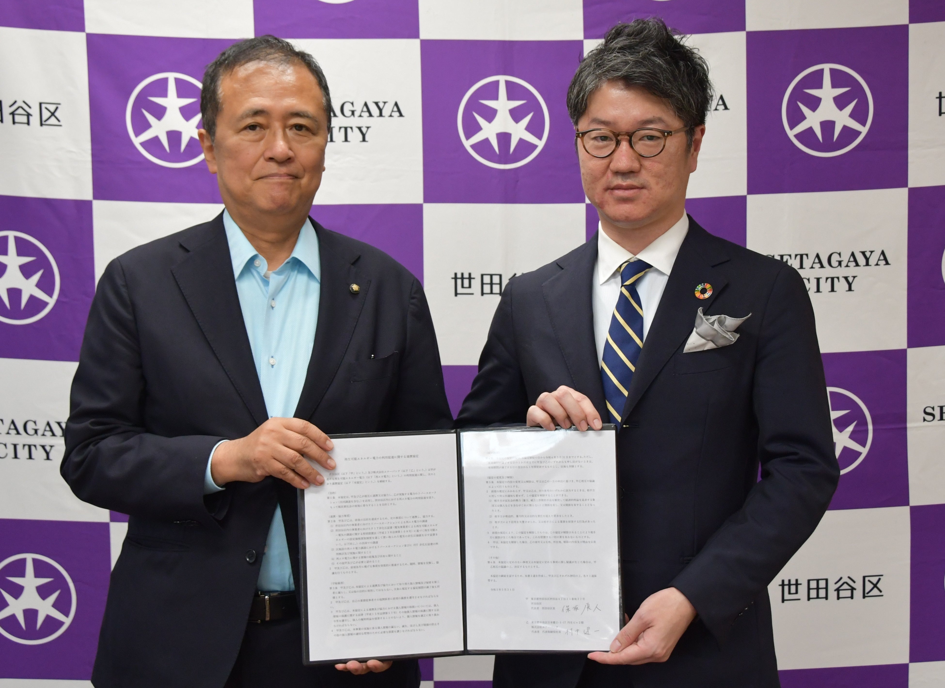 (左)世田谷区長:保坂 展人、(右)株式会社エナーバンク代表取締役:村中 健⼀