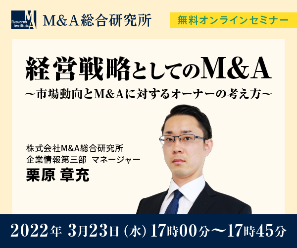 株式会社M&A総合研究所(本社:東京都千代田区、代表取締役CEO:佐上 峻作、以下「当社」)は、2022年3月23日(水)に、譲渡企業様向けに特化した無料参加可能なオンラインセミナー「経営戦略としてのM&A~市場動向とM&Aに対するオーナーの考え方~」を実施することをお知らせいたします。