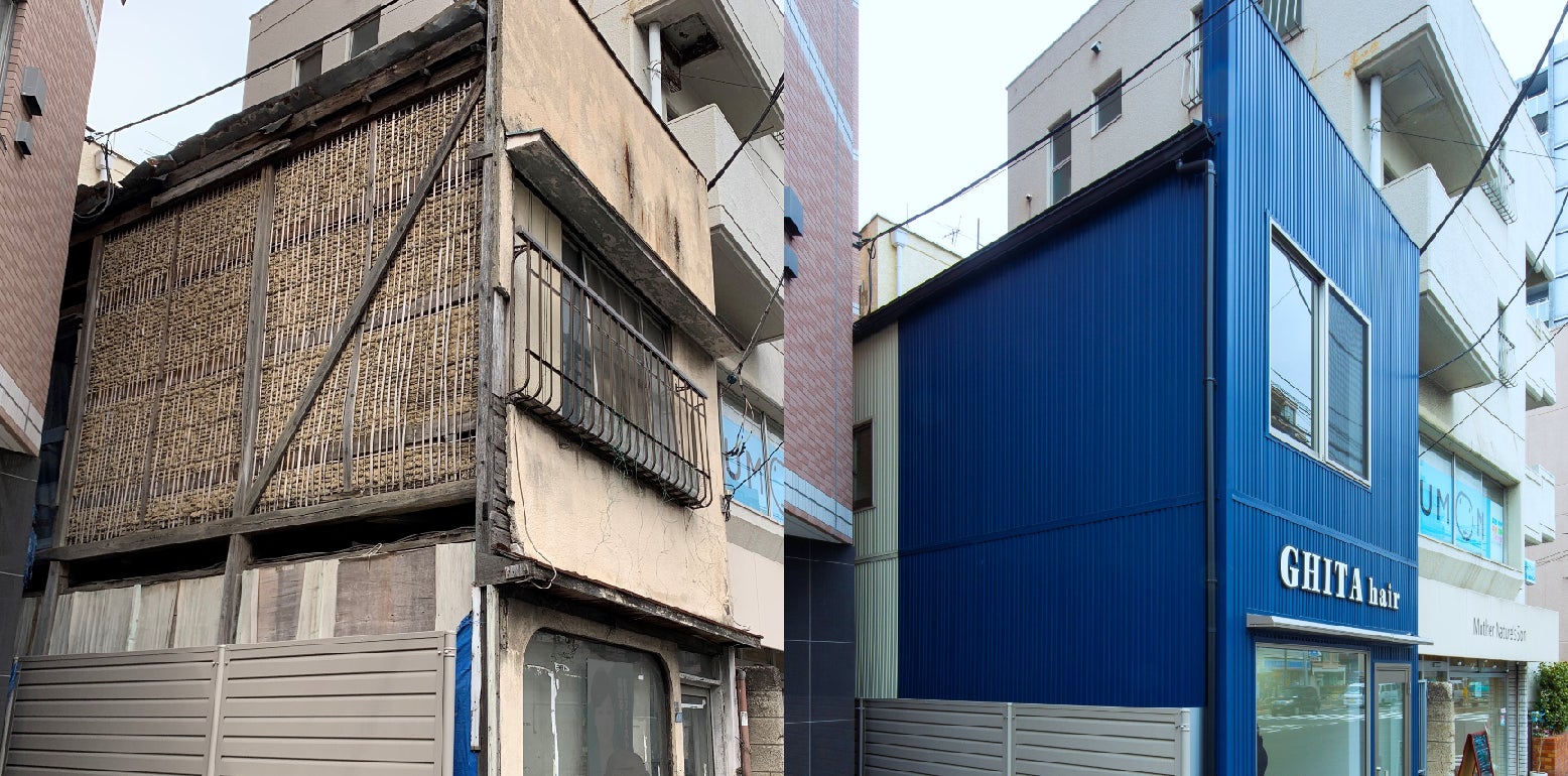 <美容室「GHITA hairdesign」として再生(物件外観のBefore/After)>