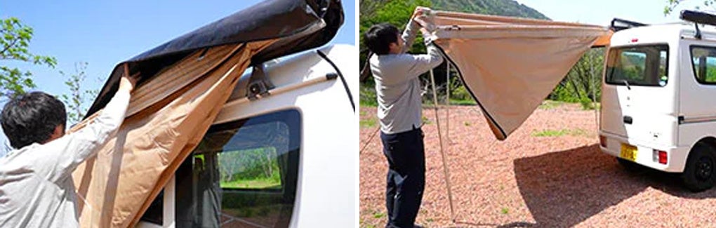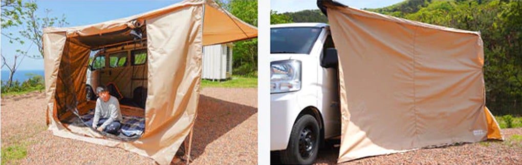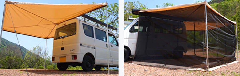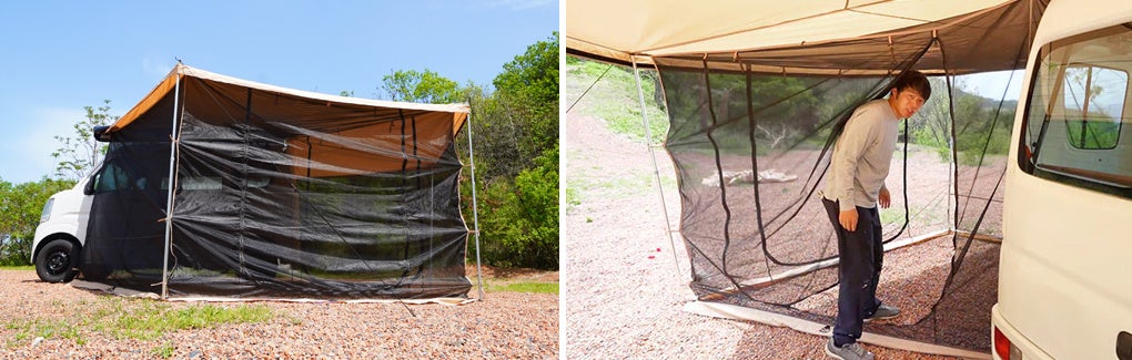 このように扇形に広げるタイプの「カーサイドオーニング」は、形状が蝙蝠の羽に似ていることから、別名バットウィングオーニングとも呼ばれ、通常の「カーサイドオーニング」よりも、広くスペースを確保することが出来ます。さらに本製品では、別売りの専用パーツである蚊帳やサイドシートを取り付けることで、テントとして使うことも可能になっております。