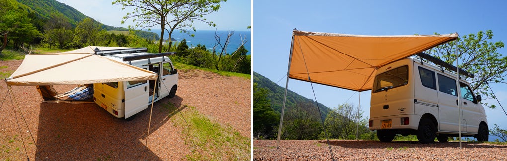 車を中心に270度取り囲むようにタープを設営することで、全長4.8mの長さでスペースを広く確保することができます。