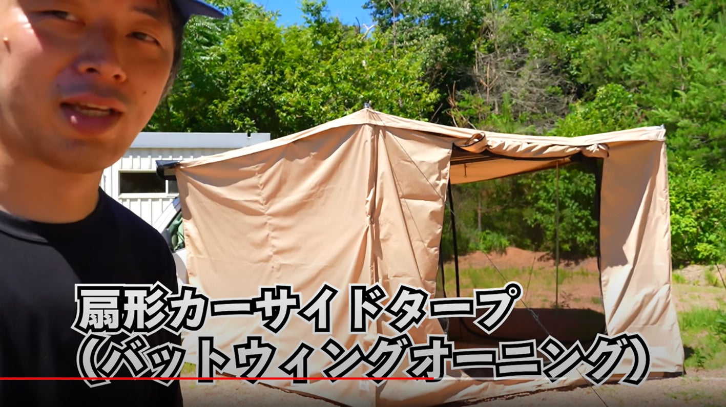 扇形にタープが広がる「バットウィングオーニング」、動画クリエイター「ともさん」の扇形カーサイドタープ発売