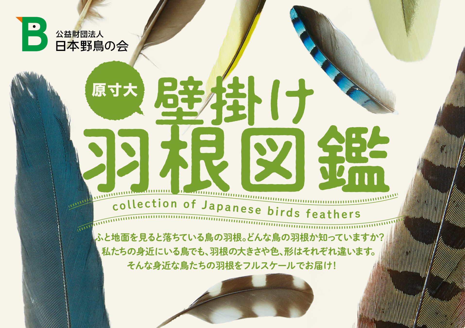 普段、道ばたや公園に落ちていてもあまり気づかれることのない野鳥の羽根。そんな野鳥の羽根に注目し、身近な鳥を中心とした11種の羽根を原寸大で紹介します。「鳥たちはこんな羽根を持っているんだ!」と興味・関心を持っていただくことで、より野鳥に愛着を感じてもらうとともに、“飾って楽しむ!“という野鳥観察にとどまらない、新たな野鳥の楽しみ方をお伝えできればと考え、このポスターを制作しました。