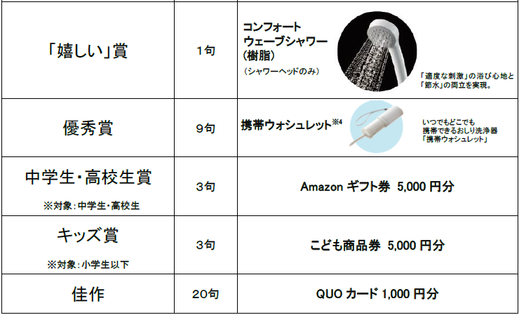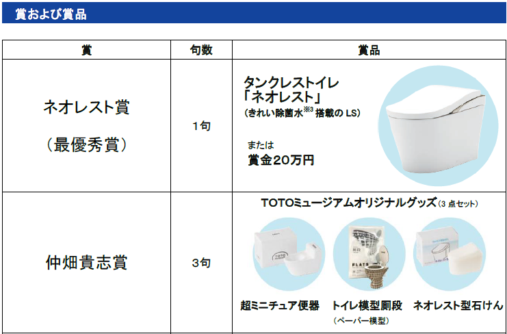 「ネオレスト賞(最優秀賞)」の他、独創的な句を選出する「仲畑貴志賞」や、小学生以下を対象とした「キッズ賞」、中学生・高校生を対象にした「中学生・高校生賞」なども設けています。皆さまの思わず笑顔になる句をお待ちしています。優秀作品※1 の20句は、トイレットペーパー型川柳集『第17回トイレ川柳大賞』<希望小売価格(予定):350円[税込み]>として、2022年11月10日(木)(トイレの日※2) にTOTO出版より発行予定です。