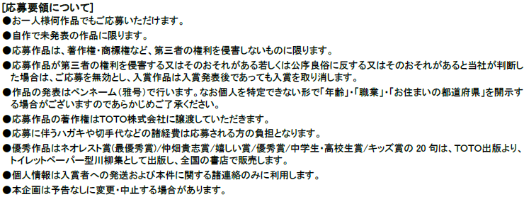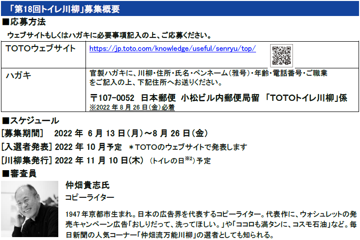 TOTO株式会社(本社:福岡県北九州市、社長:清田 徳明)は、第18回「トイレ川柳」を、2022年6月13日(月)から8月26日(金)まで募集します。