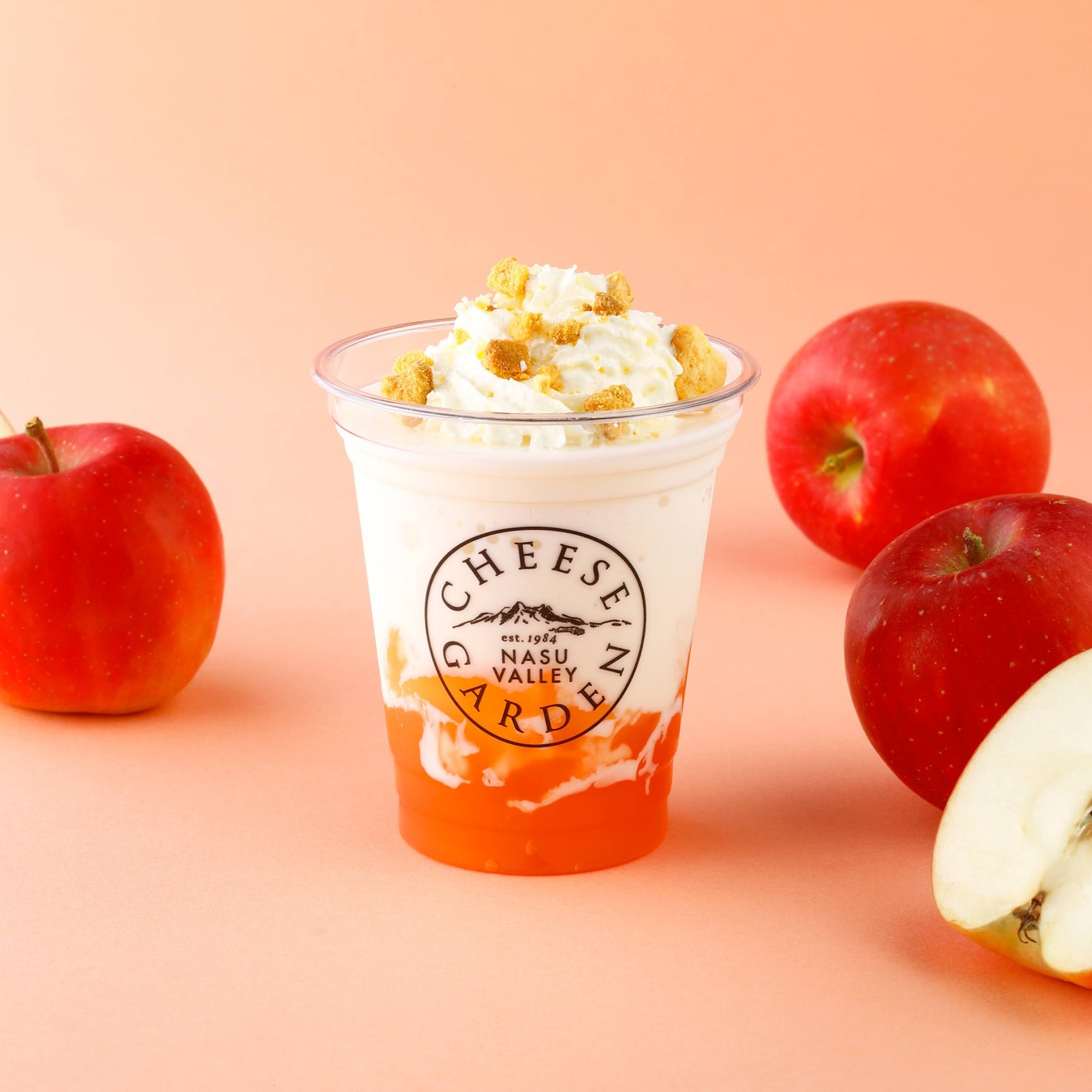 まるでレアチーズケーキを食べているかのような、すっきりとした味わいで人気のチーズドリンクに冬限定フレーバー『アップルジュレラッテ』が再登場いたします。フロマージュを使用したフローズン仕立てのチーズドリンクにチーズガーデン工房手作りのアップルジュレを加えました。みずみずしく、つるりとした舌触りのアップルジュレは混ぜずに飲むとりんごの甘酸っぱさが感じられ、崩して飲むとチーズドリンクと混ざることでまるでりんご味のレアチーズケーキを食べているかのような味わいがお楽しみいただけます。