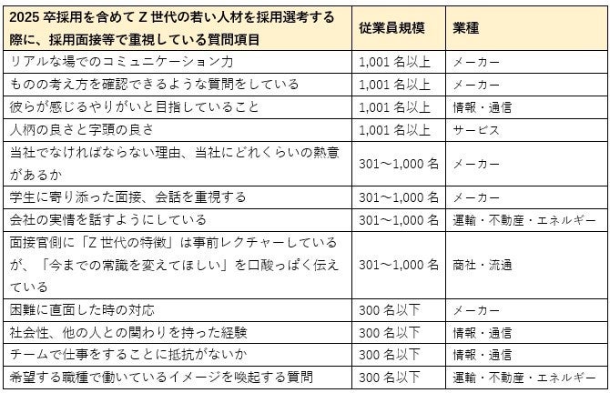 ▼Z世代人材の採用選考面接で重視している質問項目・観点 ※一部抜粋
