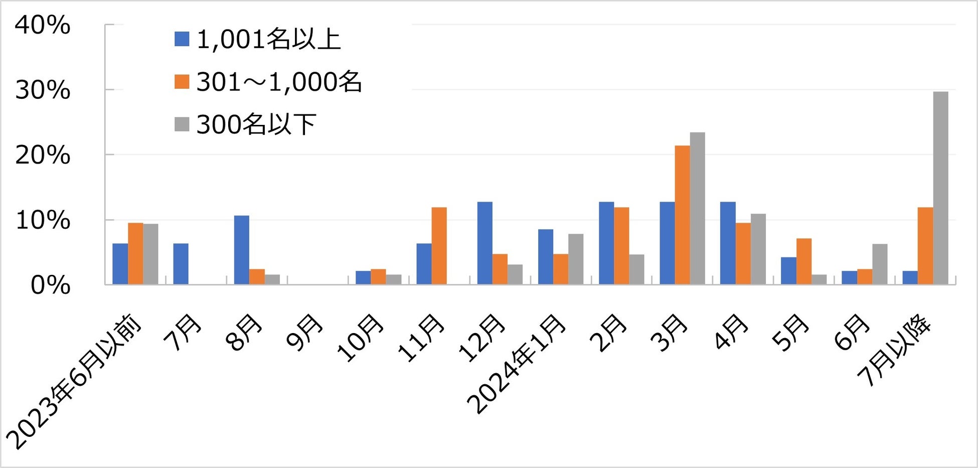 内定(内々定)出しの開始時期については、「2024年4月」が大企業15%、中堅企業17%でそれぞれ最多となっており、中小企業では19%と2割近くとなっているものの、最多は31%の「2024年月以降」となっている。また、「2024年2月まで」(「2023年6月以前」~「2024年2月」までの合計、以下同じ)に内定出しを開始する割合は、大企業では47%と半数近くに上り、採用選考開始時期と同様に大企業で早期に進行していることが分かる。中堅・中小企業では選考開始のピークを迎える前に、大企業ではすでに内定出しを開始している企業が半数近くに上っており、優秀な学生はこの時期までに志望している大企業から内定を得て就職活動を終了することも考えられ、中堅・中小企業では優秀人材を獲得しづらくなっていることがうかがえる。