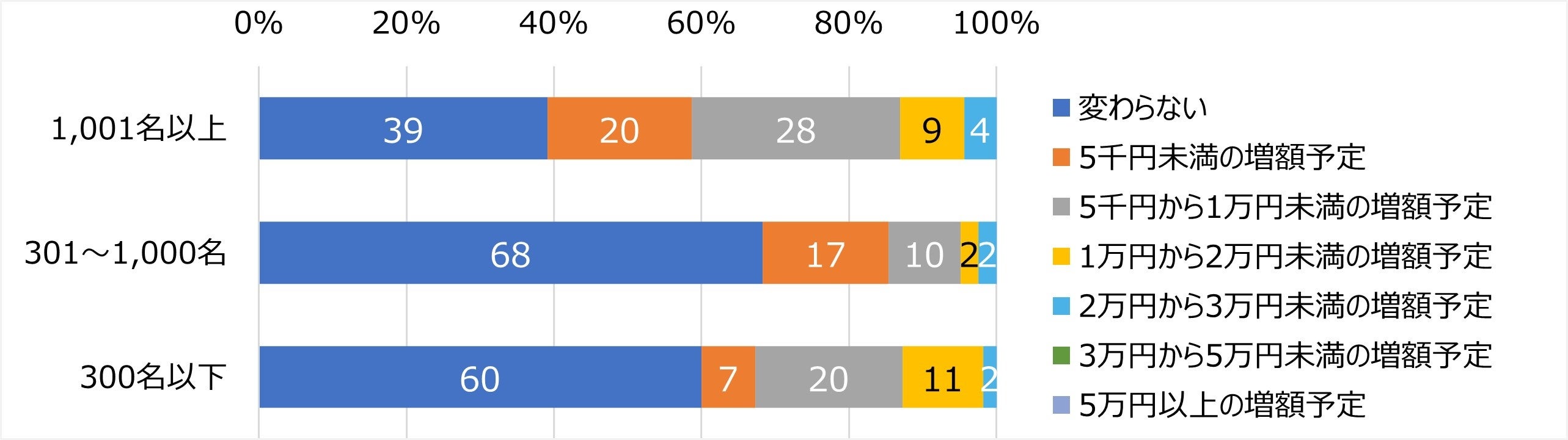 これを企業規模別に見ると、「変わらない」の割合は、中堅・中小企業ではそれぞれ68%、60%と6割以上である一方、大企業では「増額予定」が61%と6割で、「5千円以上の増額」の割合は41%と4割に上っている(図表3-2)。体力のある大企業が先行して初任給の引き上げに対応しており、中堅・中小企業との給与格差だけでなく、優秀な人材の確保力の格差も、より広がることが懸念される。