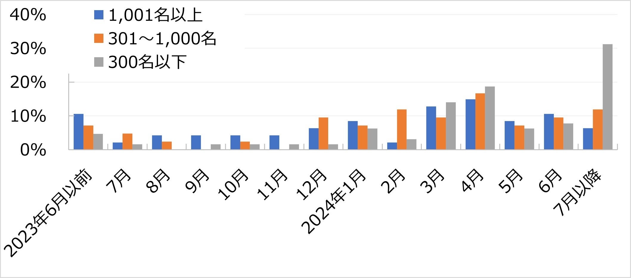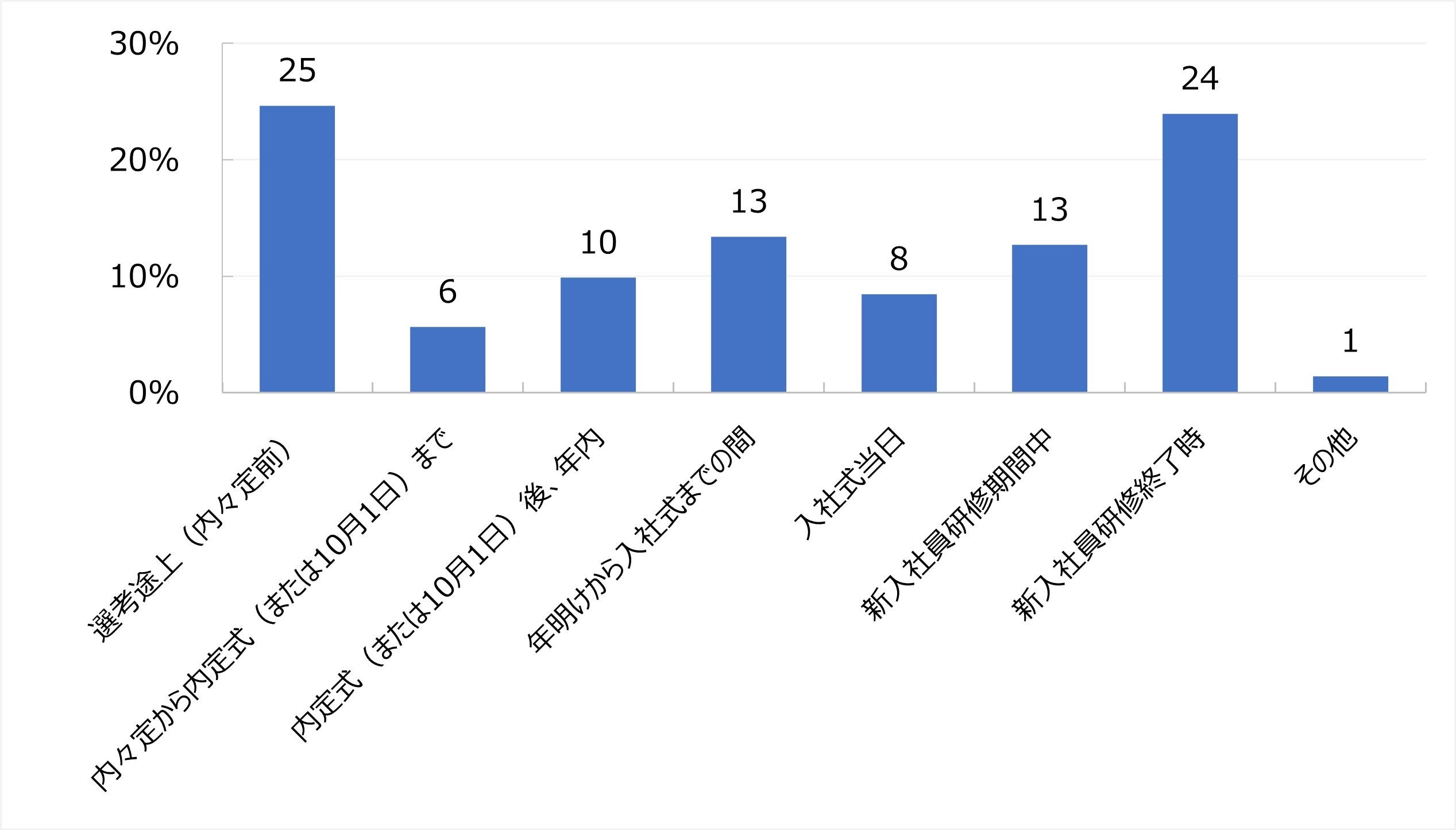 最も多いのは「選考途上(内々定前)」で25%、次いで「新入社員研修終了時」が24%となり、それぞれ4分の1程度で二極化している。