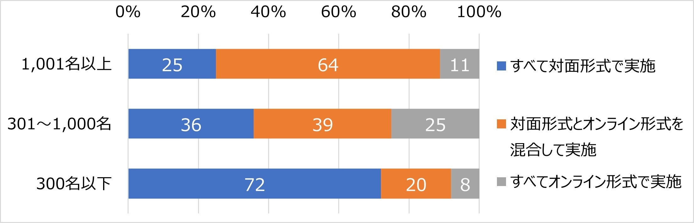インターンシップを実施している企業において、実施形式を見てみると、大企業では「対面形式とオンライン形式を混合して実施」が圧倒的に多く64%、中堅企業でも「対面形式とオンライン形式を混合して実施」が最多で39%、中小企業では「すべて対面形式で実施」が圧倒的で72%となっている。いずれの企業規模においても「すべてオンライン形式」より「すべて対面形式」の割合の方が多く、インターンシップの実施形式としては、ハイブリッドもしくは対面形式に回帰している傾向がうかがえる。