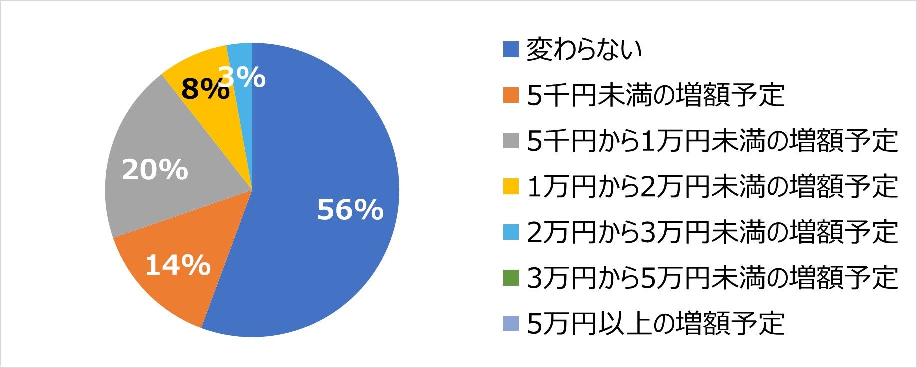 優秀な人材を確保するために初任給の引き上げをする企業が増加する傾向にある。24卒新入社員への初任給の引き上げ予定については、全体では「増額予定」(「5千円未満の増額予定」~「5万円以上の増額予定」の合計)が44%となっている。そのうち「5千円~1万円未満の増額予定」が20%で最多となり、「5千円以上の増額」(「5千円~1万円未満の増額予定」~「5万円以上の増額予定」の合計、以下同じ)は31%と3割に上っている。