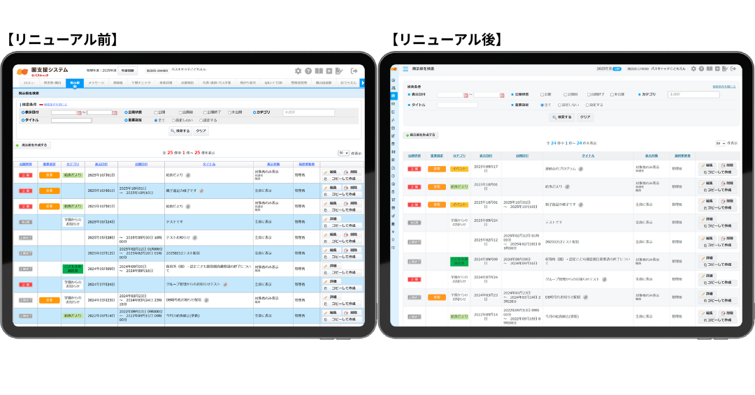 2025年でサービス開始から15年を迎えるにあたり、利用環境の変化や現場の声を踏まえ、デザインの見直しやタブレット操作性の向上を図り、より長く安心してご利用いただける管理画面を目指しました。