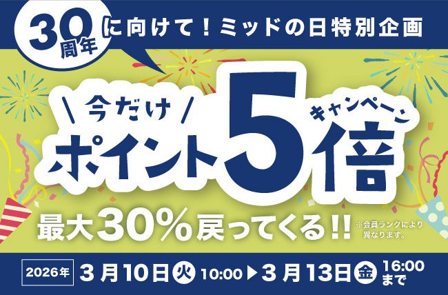 2026年の11月で、設立30周年を迎えるミッド・インターナショナルは、30周年を盛大に迎える準備として【今だけ】ポイント5倍キャンペーンを開催。