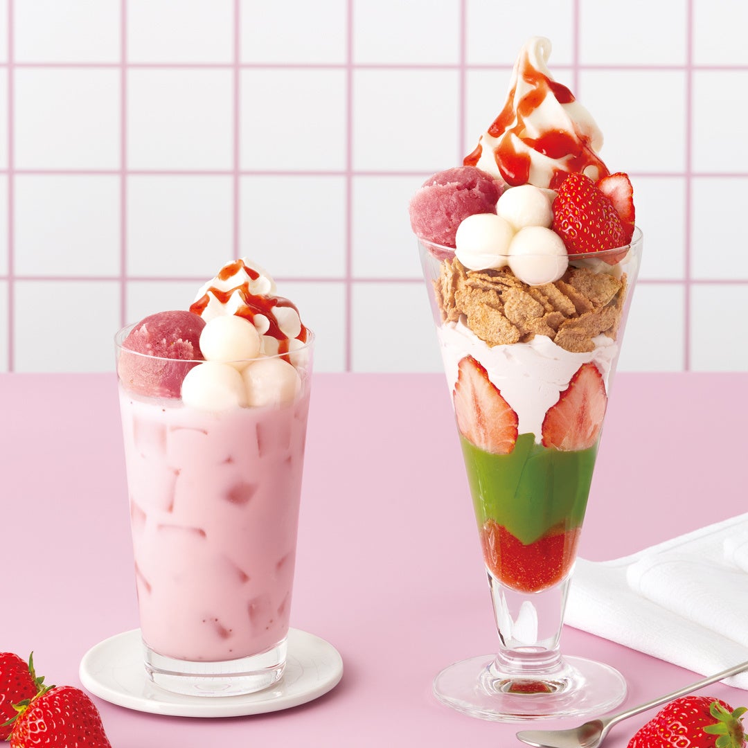 昨年大人気の苺パフェが今年も登場。ドリンクは苺あんをより楽しむラテに。4/1より期間限定で販売開始。同日よりグランドメニューも春夏仕様に。