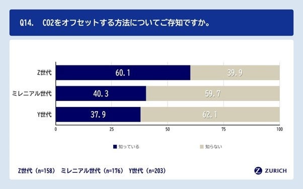 Q10で「所有している」と回答した方に、「Q14.CO2排出量をオフセット(日常生活や経済活動などで自らが排出した二酸化炭素をはじめとする温室効果ガスのうち、努力をしても削減しきれない分を、他の場所で削減・吸収することで相殺(埋め合わせ、オフセット)するという取組みのこと)する方法についてご存じですか。」と質問したところ、Z世代(n=158)は「知っている」が60.1%、「知らない」が39.9%、ミレニアル世代(n=176)は「知っている」が40.3%、「知らない」が59.7%、Y世代(n=203)は「知っている」が37.9%、「知らない」が62.1%という回答となりました。