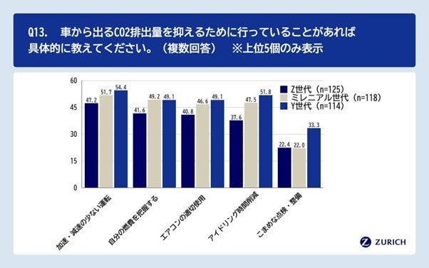 - 車のCO2排出量を抑えるため、3世代の約半数が「加速・減速の少ない運転」を実施