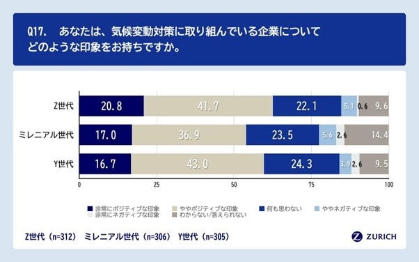 「Q17.あなたは、気候変動対策に取り組んでいる企業についてどのような印象をお持ちですか。」と質問したところ、Z世代(n=312)は「非常にポジティブな印象」が20.8%、「ややポジティブな印象」が41.7%、ミレニアル世代(n=306)は「非常にポジティブな印象」が17.0%、「ややポジティブな印象」が36.9%、Y世代(n=305)は「非常にポジティブな印象」が16.7%、「ややポジティブな印象」が43.0%という回答となりました。