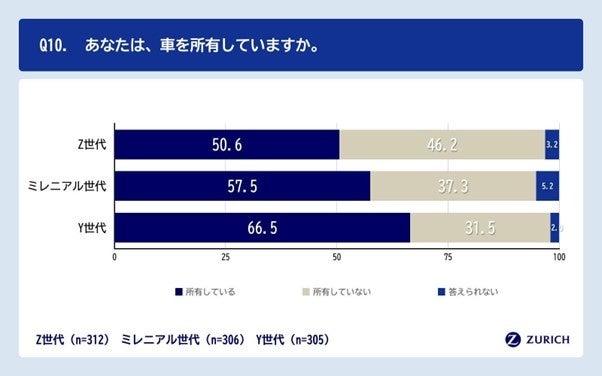 「Q10.あなたは、車を所有していますか。」と質問したところ、Z世代(n=312)は「所有している」が50.6%、「所有していない」が46.2%、ミレニアル世代(n=306)は「所有している」が57.5%、「所有していない」が37.3%、Y世代(n=305)は「所有している」が66.5%、「所有していない」が31.5%という回答となりました。