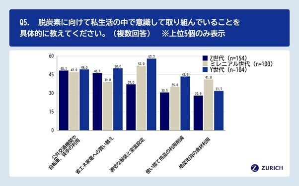Q4で「ある」と回答した方に、「Q5.脱炭素に向けて私生活の中で意識して取り組んでいることを具体的に教えてください。(複数回答)」と質問したところ、Z世代(n=154)は「公共交通機関や自転車、徒歩の利用」が48.1%、「省エネ家電への買い替え」が46.1%、ミレニアル世代(n=100)は「適切な服装と室温設定」が52.0%、「公共交通機関や自転車、徒歩の利用」が47.0%、Y世代(n=104)は「適切な服装と室温設定」が57.7%、「省エネ家電への買い替え」が50.0%という回答となりました。