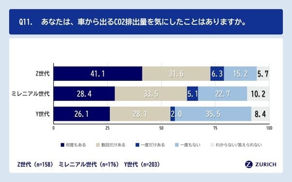 Q10で「所有している」と回答した方に、「Q11.あなたは、車から出るCO2排出量を気にしたことはありますか。」と質問したところ、Z世代(n=158)は「何度もある」が41.1%、「数回だけある」が31.6%、ミレニアル世代(n=176)は「何度もある」が28.4%、「数回だけある」が33.5%、Y世代(n=203)は「何度もある」が26.1%、「数回だけある」が28.1%という回答となりました。