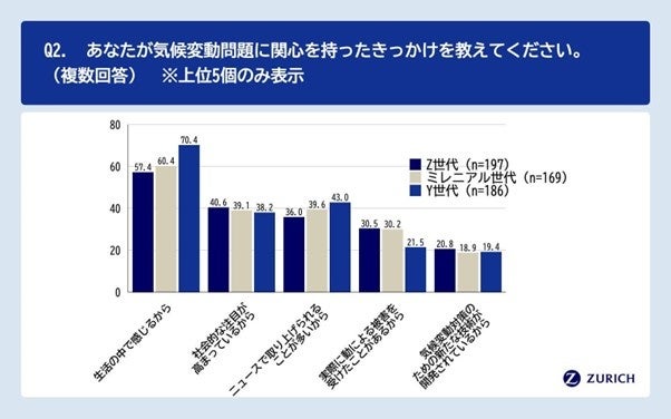 - 気候変動問題に関心を持ったきっかけは、3世代に共通して「生活の中で感じるから」が最多
