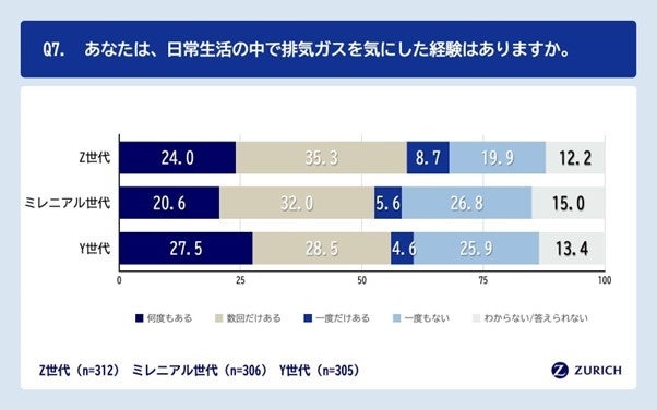 「Q7.あなたは、日常生活の中で排気ガスを気にした経験はありますか。」と質問したところ、Z世代(n=312)は「何度もある」が24.0%、「数回だけある」が35.3%、ミレニアル世代(n=306)は「何度もある」が20.6%、「数回だけある」が32.0%、Y世代(n=305)は「何度もある」が27.5%、「数回だけある」が28.5%という回答となりました。
