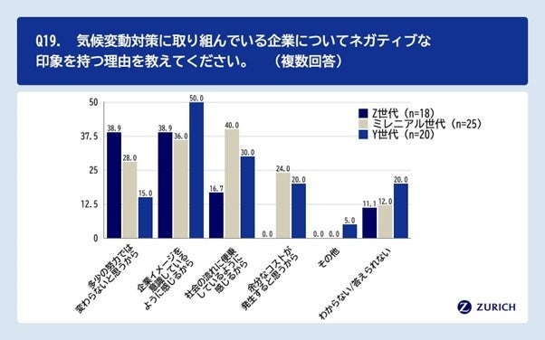 Q17で「ややネガティブな印象」「非常にネガティブな印象」と回答した方に、「Q19.気候変動対策に取り組んでいる企業についてネガティブな印象を持つ理由を教えてください。(複数回答)」と質問したところ、Z世代(n=18)は「多少の努力では変わらないと思うから」が38.9%、「企業イメージを意識しているように感じるから」が38.9%、ミレニアル世代(n=25)は「社会の流れに便乗しているように感じるから」が40.0%、「企業イメージを意識しているように感じるから」が36.0%、Y世代(n=20)は「企業イメージを意識しているように感じるから」が50.0%、「社会の流れに便乗しているように感じるから」が30.0%という回答となりました。
