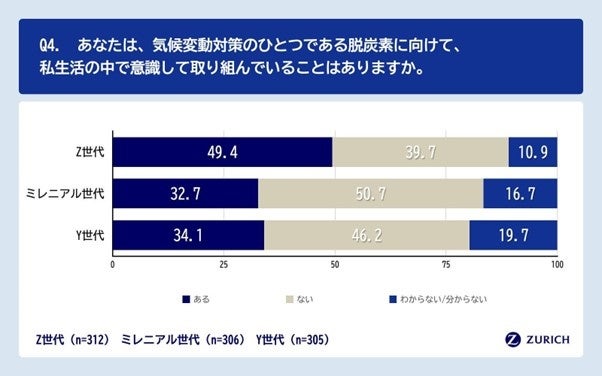 「Q4.あなたは、気候変動対策のひとつである脱炭素(CO2である二酸化炭素をはじめとする温室効果ガスの排出量をゼロにする取り組み)に向けて、私生活の中で意識して取り組んでいることはありますか。」と質問したところ、Z世代(n=312)は「ある」が49.4%、「ない」が39.7%、ミレニアル世代(n=306)は「ある」が32.7%、「ない」が50.7%、Y世代(n=305)は「ある」が34.1%、「ない」が46.2%という回答となりました。