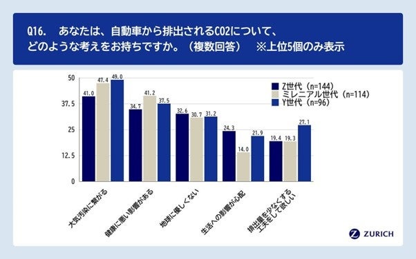 Q10で「所有していない」と回答した方に、「Q16.あなたは、自動車から排出されるCO2について、どのような考えをお持ちですか。(複数回答)」と質問したところ、Z世代(n=144)は「大気汚染に繋がる」が41.0%、「健康に悪い影響がある」が34.7%、ミレニアル世代(n=114)は「大気汚染に繋がる」が47.4%、「健康に悪い影響がある」が41.2%、Y世代(n=96)は「大気汚染に繋がる」が49.0%、「健康に悪い影響がある」が37.5%という回答となりました。