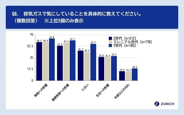 Q7で「何度もある」「数回だけある」「一度だけある」と回答した方に、「Q8.排気ガスで気にしていることを具体的に教えてください。(複数回答)」と質問したところ、Z世代(n=212)は「環境への影響」が58.5%、「健康被害への影響」が52.8%、ミレニアル世代(n=178)は「環境への影響」が58.4%、「健康被害への影響」が57.3%、Y世代(n=185)は「環境への影響」が63.8%、「健康被害への影響」が61.1%という回答となりました。
