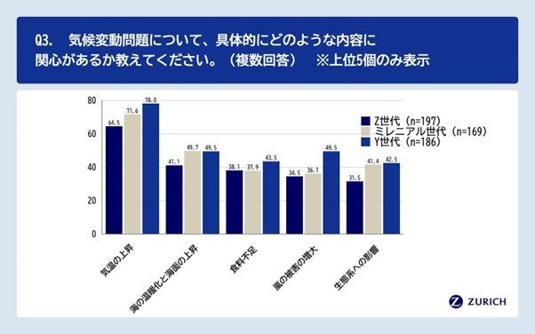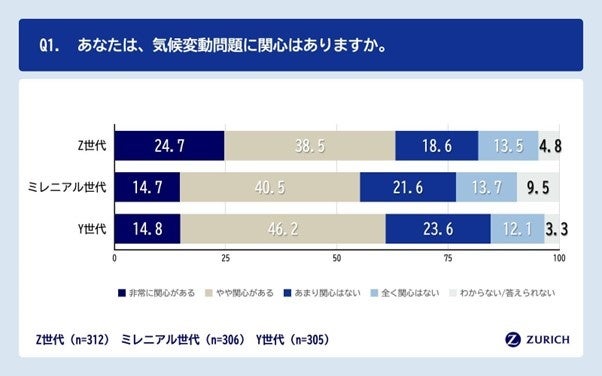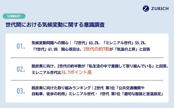 - 気候変動問題に最も関心が高いのは「Z世代」で63.2%、「ミレニアル世代」比8ポイント高