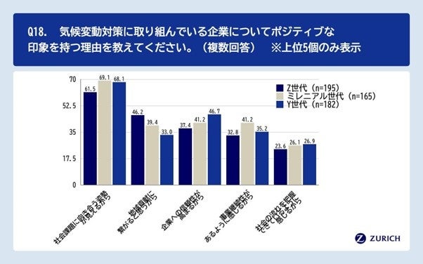 Q17で「非常にポジティブな印象」「ややポジティブな印象」と回答した方に、「Q18.気候変動対策に取り組んでいる企業についてポジティブな印象を持つ理由を教えてください。(複数回答)」と質問したところ、Z世代(n=195)は「社会課題に向き合う姿勢が見えるから」が61.5%、「地域貢献に繋がると思うから」が46.2%、ミレニアル世代(n=165)は「社会課題に向き合う姿勢が見えるから」が69.1%、「事業継続性があるように感じるから」が41.2%、Y世代(n=182)は「社会課題に向き合う姿勢が見えるから」が68.1%、「企業への信頼性が高まるから」が46.7%という回答となりました。