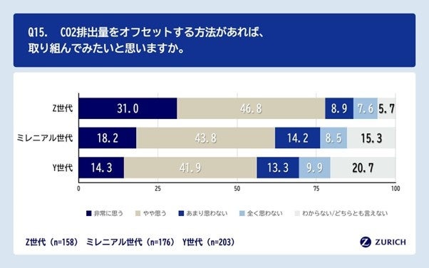 Q10で「所有している」と回答した方に、「Q15.CO2排出量をオフセットする方法があれば、取り組んでみたいと思いますか。」と質問したところ、Z世代(n=158)は「非常に思う」が31.0%、「やや思う」が46.8%、ミレニアル世代(n=176)は「非常に思う」が18.2%、「やや思う」が43.8%、Y世代(n=203)は「非常に思う」が14.3%、「やや思う」が41.9%という回答となりました。