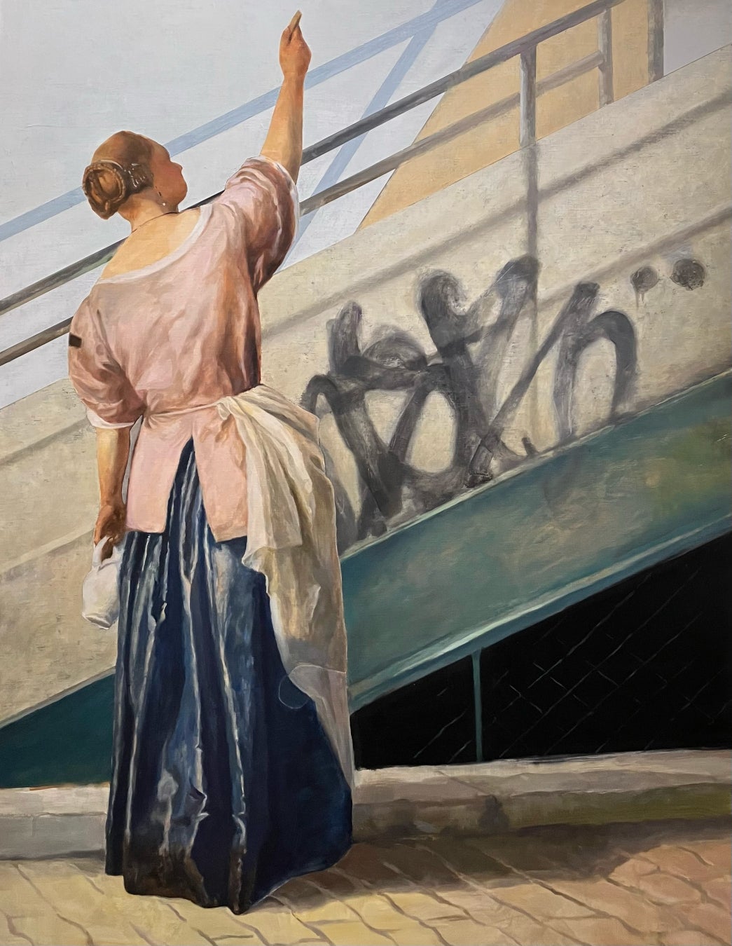 岩岡純子は、西洋美術の名画と現代の日本の風景を重ね合わせ、タイムスリップのような構図で作品を展開します。名画の中の人物が現代の日本に存在しているようなシーンを描き、歴史と現代の文化的なギャップを探求しながら、現代社会を示唆する作品へと昇華させます。