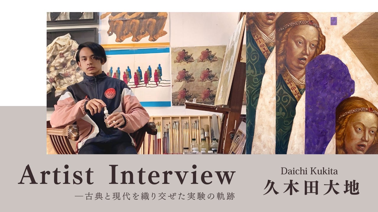 久木田は、武蔵野美術大学油絵科に在籍中の注目の作家です。現代における古典絵画の需要や同一イメージが反復・並列されることによって生み出される視覚的な愉しさを表出することをテーマとする制作を続けています。創作のきっかけや歴史的・現代的なモチーフの選び方などをお聞きしました。