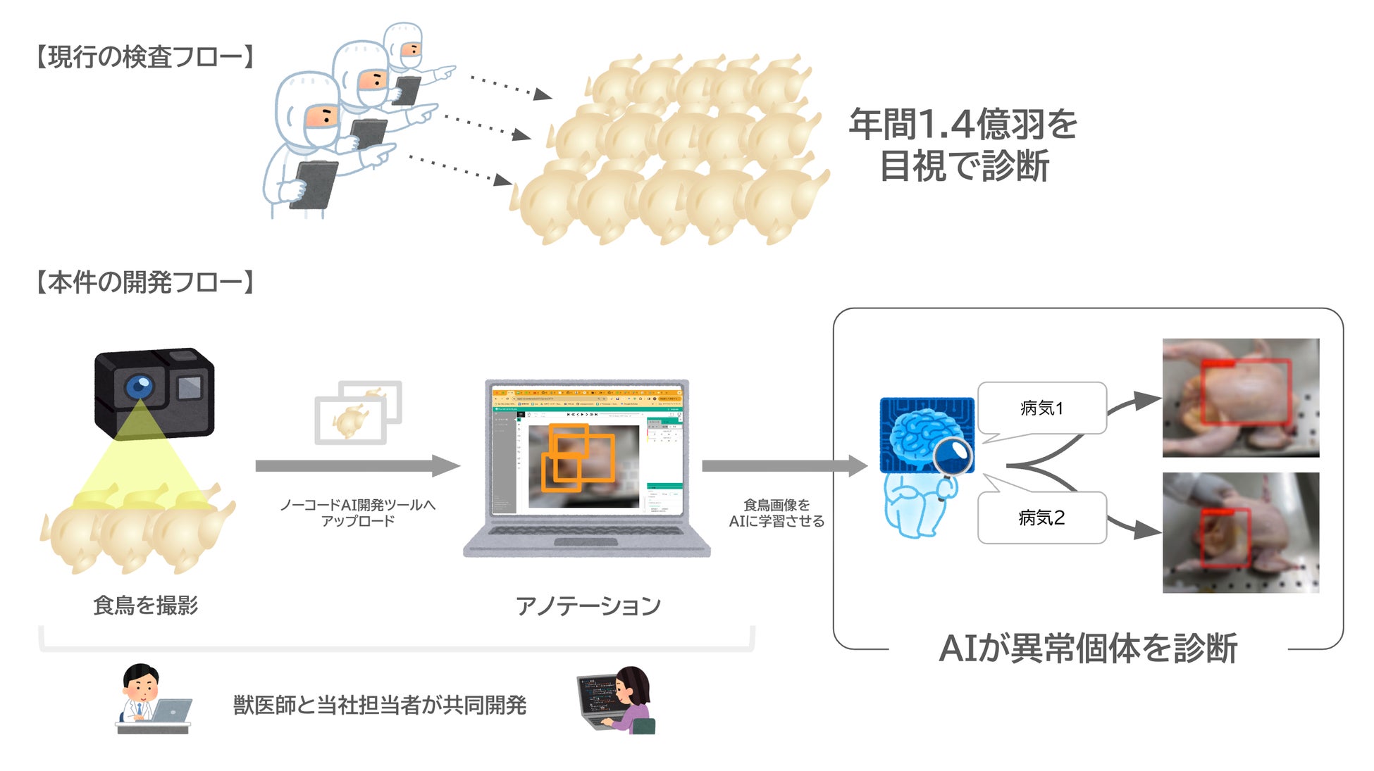 ノーコードツールを利用し、現場の検査員と共同で開発することで、年間1.4億羽以上実施されている食鳥検査の省力化を支援するAIを約3ヶ月間で開発
