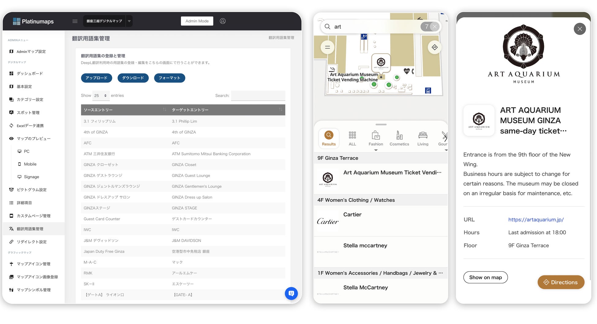 案内の効率化と満足度向上を同時に実現するため、来店客自身がスマートフォンやサイネージから簡単に確認できるよう、多言語対応のデジタルマップを「プラチナモール」で構築し、公開。